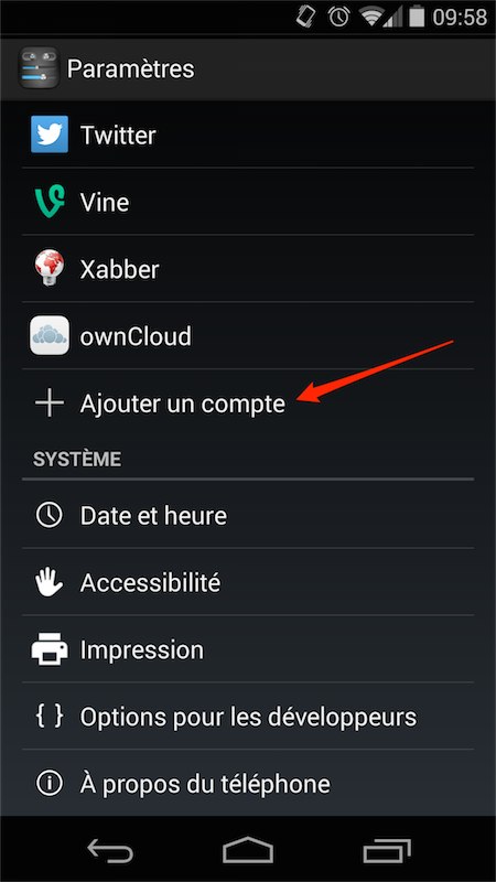 Allez dans les paramètres de votre téléphone. Vérifiez que vous avez une connexion 3G ou Wifi active et fonctionnelle. Cliquez sur "Ajouter un compte" |