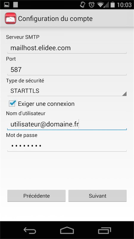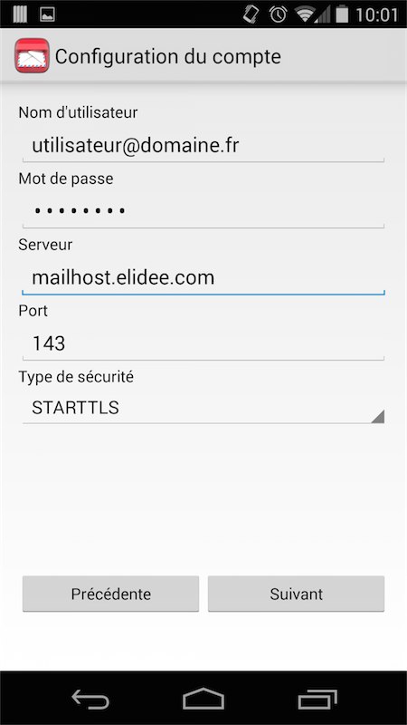 Il vous faut à nouveau saisir votre adresse email et votre mot de passe. Le serveur entrant est mailhost.elidee.com et le port 143. Choisissez STARTTLS comme sécurité afin que vos emails ne transitent pas en clair sur Internet. |