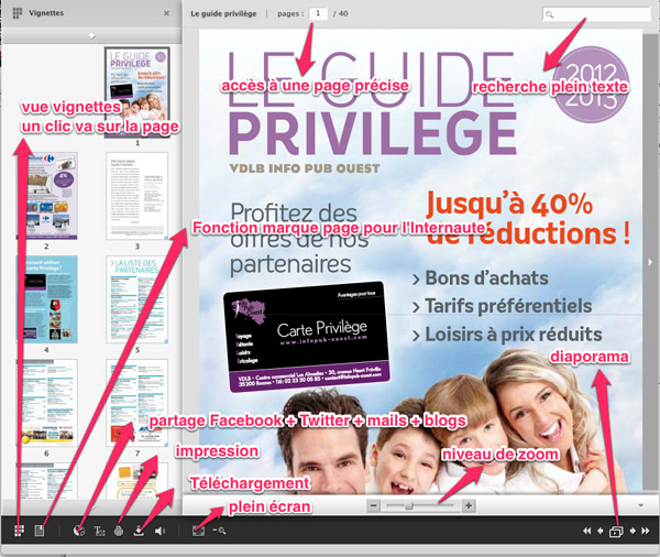 Réalisation d'un catalogue feuilletable intégré à votre site Internet d'après votre document PDF. Nombreuses fonctions incluses dont le partage Facebook - Twitter - mails, fonction marque page, zoom, plein écran, téléchargement, etc...