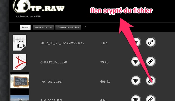 Avec les identifiants créés depuis le navigateur allez sur http://web.ftpraw.com/ et téléchargez vos fichiers psd, mov, avi, zip ! Enfin ce que vous voulez partager avec votre partenaire.