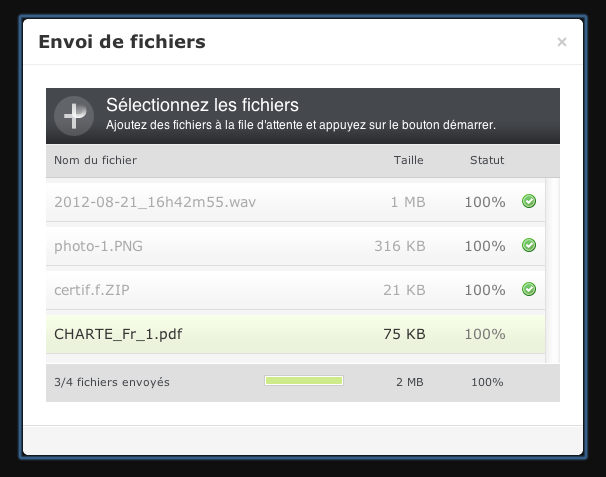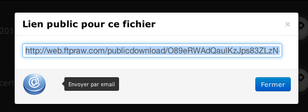 Nouveauté dernier trimestre 2012 : Vous pouvez dés maintenant partager vos fichiers directement depuis votre navigateur Internet. Votre correspondant va pouvoir télécharger vos fichiers simplement depuis son navigateur. Il pourra aussi envoyer ses fichiers par simple glisser - déposer depuis son bureau (navigateur compatible HTML 5 Firexfox, Safari ou Chrome). L'envoi par upload http est limité à 200 Mo ( et en fonction de la mémoire vive de votre ordinateur). En téléchargement (réception), il n'y a pas de limitation.