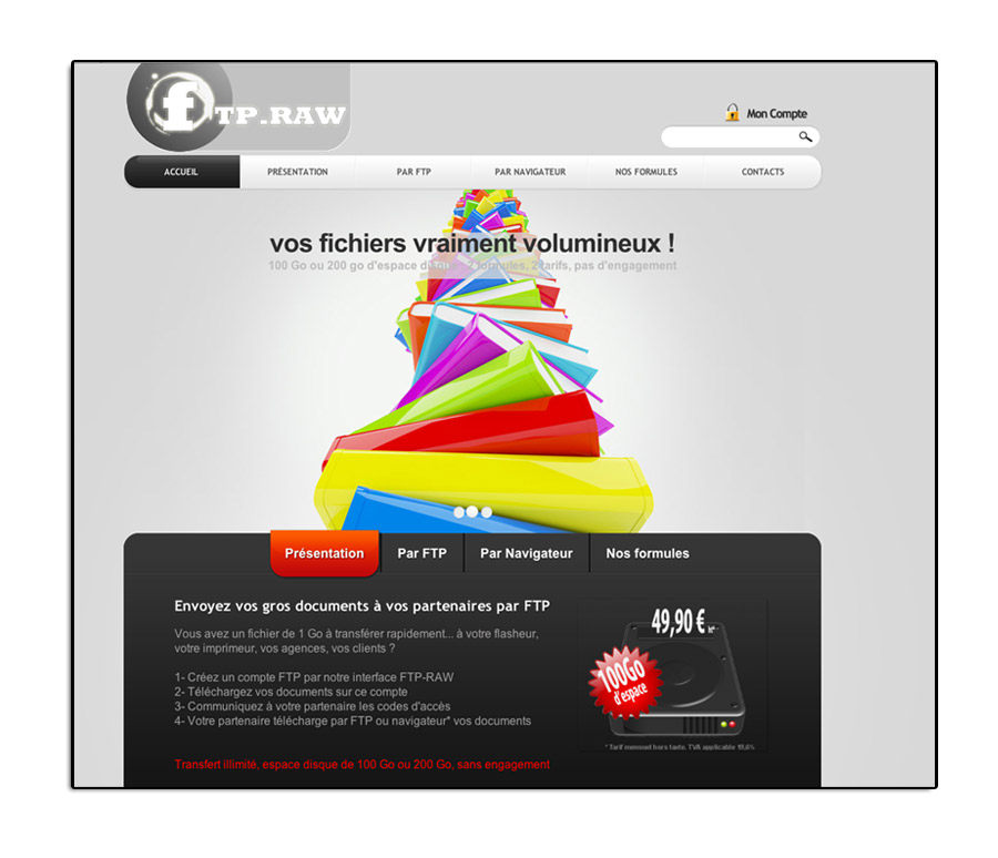 FTP Raw est la solution de transfert pour fichiers volumineux. Création de comptes FTP et gestion des comptes simplifié depuis votre navigateur. Téléchargement des fichiers par logiciel FTP ou navigateur Internet.
